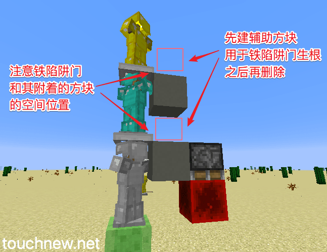 注意"铁陷阱门"的位置, 建议先建辅助方块, 好让"铁陷阱门"有地方生根, 等建好"铁陷阱门"后, 再把辅助方块去掉: